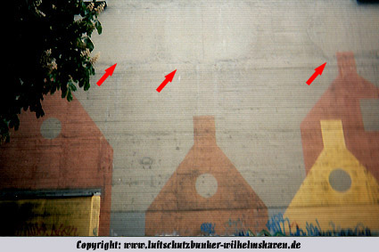 Eine von mehreren bombenabweisenden schrägen Betonplatten an den Außenwänden des Bunkers am Dachbereich...
