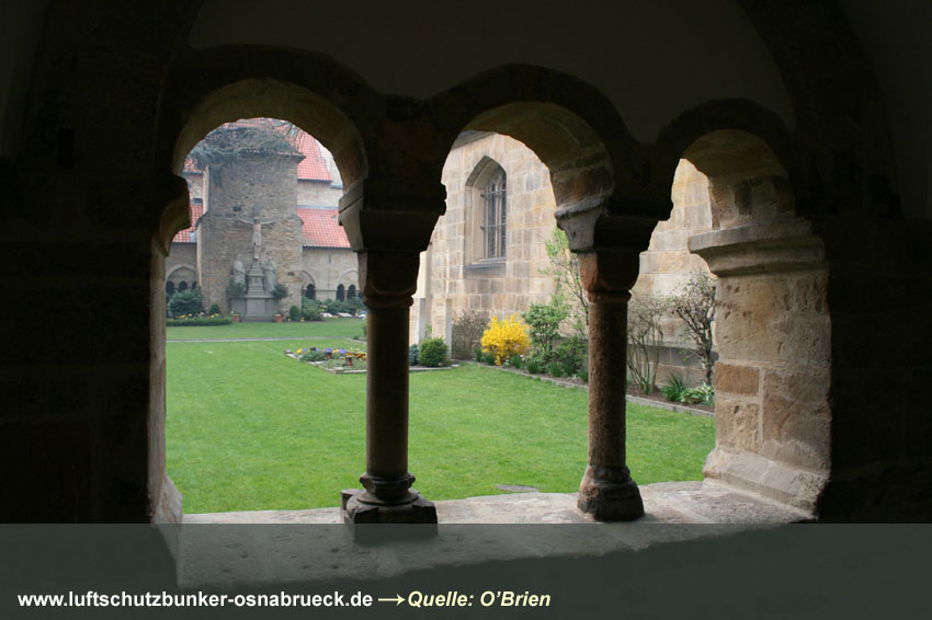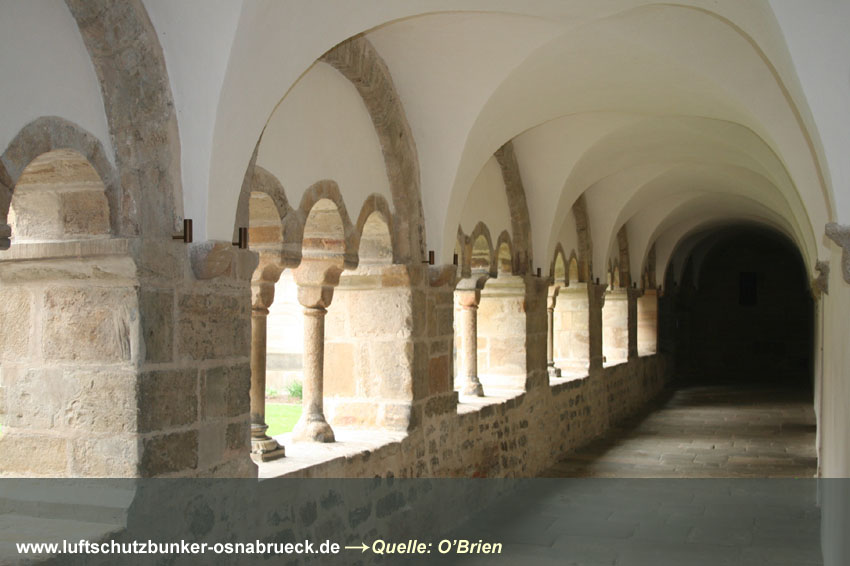 Dieser Dieser Kreuzgang gehört zum Dom in Osnabrück und wurde zum Luftschutzraum umfunktioniert. Alle Galerien zur Gartenseite wurden zugemauert. Die dicken Mauern und das Gewölbe waren sehr stabil ausgelegt. Der Schutzraum, in zwei Gängen L-förmig angelegt, war nach Hinweisen für etwa 280 Personen vorgesehen.