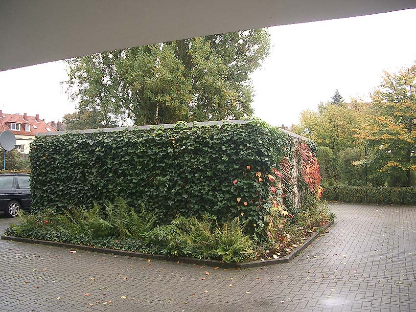 Bilder unten: Der Bunker stand bildmittig auf dem Parkplatz im Bereich der erkennbaren Garagen. Zunächst war in den 1980er Jahren das Dach mit Erde und Pflanzwerk begrünt worden. Wilder Wein wurde an den Wänden gepflanzt. Ende 1990 bis Anfang 1991 wurde der Luftschutzbunker für den Bau eines neuen Wohnhauses beseitigt.
