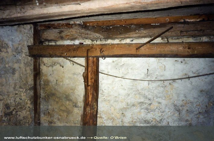Einfacher, äußerlich nicht sichtbar verbunkerter LS-Keller in der Kokschen Straße (im Stadtteil Wüste) in Osnabrück. Die zur Abstützung dienenden Holzstämme wurden 2007 während einer Komplettsanierung des Kellers entfernt (in Tabelle nicht aufgelistet). Keller erhalten / LS-Relikte entfernt