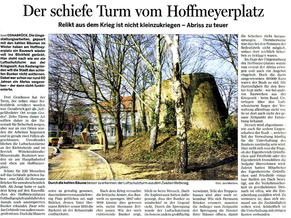Aktuell wurde ein umfangreicher Artikel über den Luftschutzturm Hoffmeyerplatz in der Osnabrücker Tagespresse veröffentlicht: Hier |