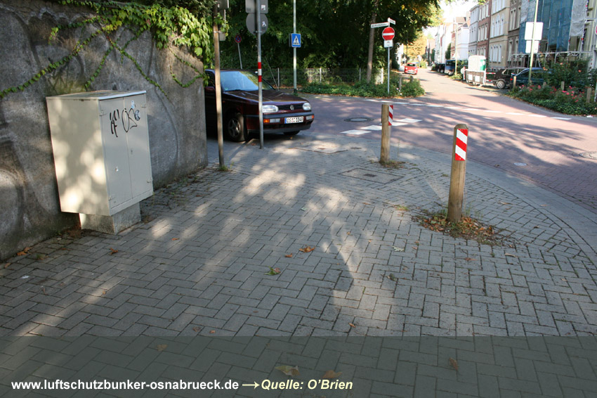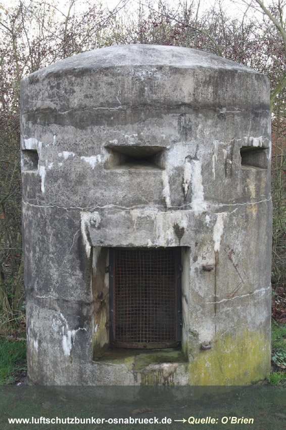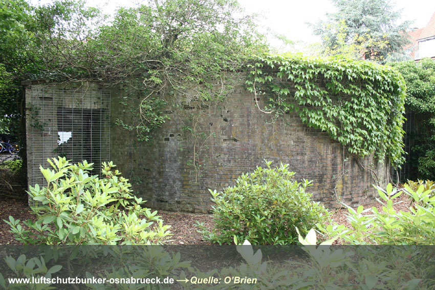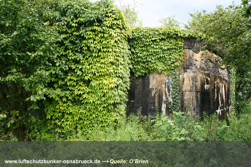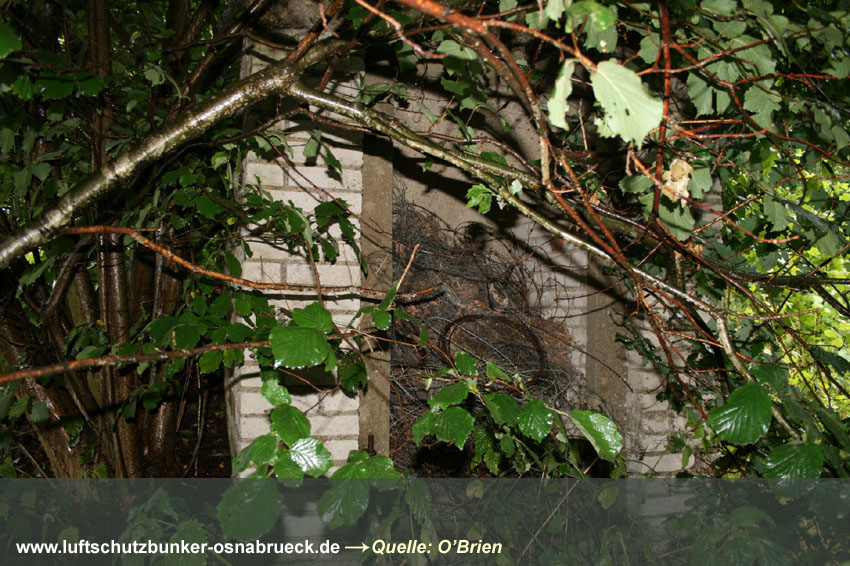 Bilder eines verschütteten Erdbunkers am Hunteburger Weg Ecke Ickerweg konnten eingefügt werden. Dieser privat errichtete Luftschutzraum befindet sich unweit östlich der ehemaligen Teuto-Metallwerke. Er diente den Bewohnern der anliegenden Häuser und des Gehöftes nördlich als Schutz. Der Erdbunker ist nicht mehr zugänglich und wurde wohl bald nach dem Krieg zugeschüttet. Es könnte auch sein, dass das Bauwerk gesprengt wurde. Aufgrund der Teuto-Metallwerke wird die Errichtung des Bunkers erfolgt sein, da um das Werk herum ständig mit Luftangriffen gerechnet wurde. Hier Dank an unsere Partnerseite www.untergrundosnabrueck.de. Brandwache nachgewiesen: Es handelt sich bei diesem Objekt um eine gemauerte Brandwache / Brandwachenstand / kurz BWS auf dem Gelände der alten Caprivikaserne. Der Unterstand befindet sich im südlichen Bereich des Geländes nahe der alten Offiziersunterkünfte und ist heute teilweise überbaut. Die Sichtscharten wurden nach dem Krieg offenbar durch die Briten versiegelt. Sehr selten wurden in Osnabrück Brandwachen errichtet - die nachgewiesenen Bauten nur im militärischen Bereich. Dies scheint die letzte existente Brandwache Osnabrücks zu sein. Hier Dank an unsere Partnerseite www.untergrundosnabrueck.de. |