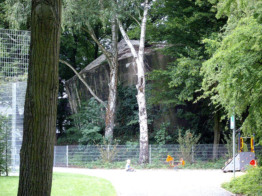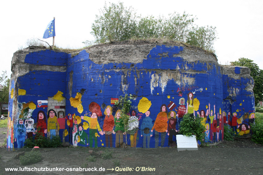 Ein Foto, bevor der Bunker im Zuge der Europawahl bemalt wurde... Die Standorte zweier bisher nicht verzeichneter betonierter Deckungsgräben konnten nachgewiesen werden. Es handelt sich um die Gräben Hoffmeyerplatz 1 und 2. Hier und Hier Nach dem Krieg wurden die beiden Anlagen wohl restlos beseitigt. Lediglich beim zweiten Objekt, das ein relativ großer Zickzackstollen war, kann vermutet werden, dass Reste unter Erdgleiche noch vorhanden sind. Die Rasenfläche zeigt genau am ehemaligen Standort Veränderungen zum Umfeld auf. Auch konnte der Standort des ehemaligen Feuerlöschteiches Hoffmeyerplatz ausfindig gemacht werden. Heute ist von ihm allerdings nichts mehr zu erkennen. Hier Ein Bild des noch intakten LS-Turmes Hoffmeyerplatz von 1945 konnte eingefügt werden. Hier Zum mutmaßlichen LS-Keller unter dem Bahnhof Hasbergen: