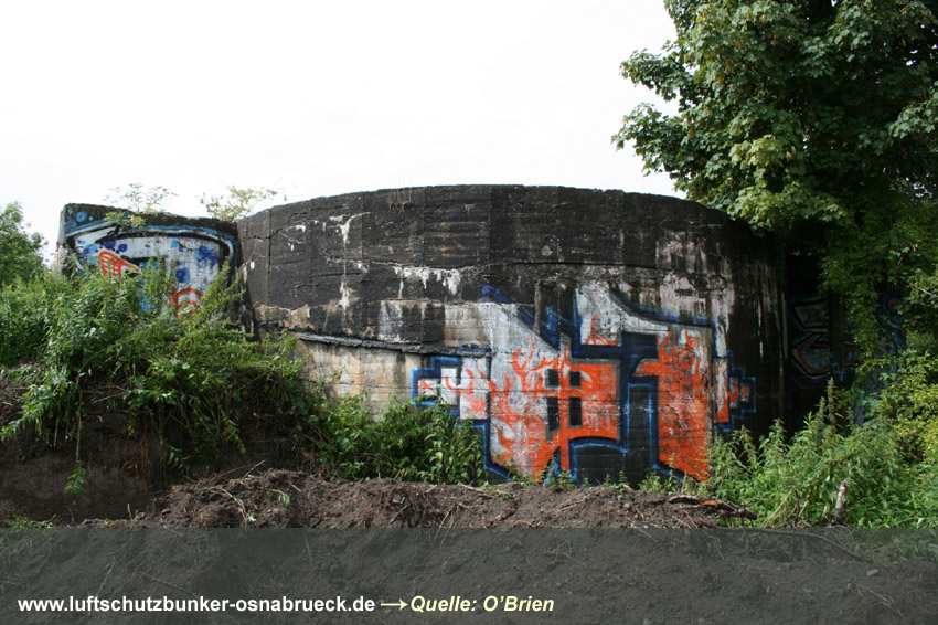 Nun ist es soweit: Der Reichsbahnrundbunker 2 in Rheine wird heute, Montag, den 24.08.09 und morgen, Dienstag, den 25.08.09 abgerissen: Intern: Hier Extern: Hier Aufnahmen des Rundbunkers hinter dem Schnatgang wurden eingefügt. Der Bunker wird als "Ersatz" auf das bereits vollendete Fundament des nicht realisierten LS-Turmes Schnatgang gesetzt worden sein. Vielen Dank an den freundlichen Anwohner aus der Wüstenstraße für die Fotografierermöglichung! Hier Eine Aufnahme des Standortes vom WLS-Hochbunker Karmann im Stadtteil OS-Wüste konnte eingefügt werden. Das Bild zeigt den bereits mit einem Nachkriegsgebäude überbauten Hochbunker (Flachbunker). Der Bunker wurde Ende 1993 bis Anfang 1994 mitsamt der restlichen alten Werksbebauung entfernt. Hier Aufnahmen der schweren Flakstellung bei Ohrbeck, zugehörig zum äußeren Luftverteidigungsbereich Osnabrücks, konnten eingefügt werden. Verbunkerungen der Geschützbettungen werden hier nicht veranlasst worden sein. Hier Eine weitere LS-Anlage konnte zugefügt werden: Es handelt sich um einen Kleinst-Spitzbunker mit außergewöhnlich starker Betonkegeldecke an der Gartlage. Hier