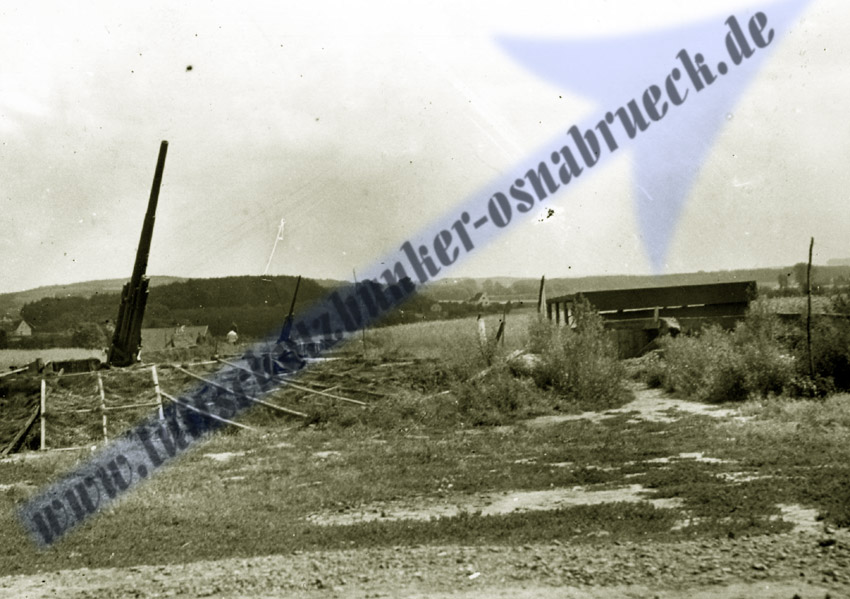 Eine seltene historische Fotoaufnahme aus dem Bereich der ehemaligen Flakstellung auf dem Lammersbrink nahe dem Varusturm bei Georgsmarienhütte wurde eingefügt. Die Stellung war zusammen mit mehreren anderen Flakstellungen für den Schutz des kriegswichtigen Georgsmarienhütte zuständig. Die Aufnahme aus frühen Kriegstagen zeigt einen hölzernen Flakturm der Stellung. Dieser Turm wurde höchstwahrscheinlich auf einem verbunkerten Betonfundament gebaut, welches standardisiert realisiert wurde und durch seine Form auch als "Flakstern" bezeichnet wird. Derartige Fundamente sind im gesamten Osnabrücker Umkreis noch heute vermehrt anzufinden. Auch im Bereich der ehemaligen Flakstellung auf dem Lammersbrink sind gesprengte Reste der "Flaksterne" noch heute erkennbar. Vielen Dank für die freundliche Bereitstellung der Aufnahme an Herrn Beermann! Hier