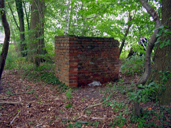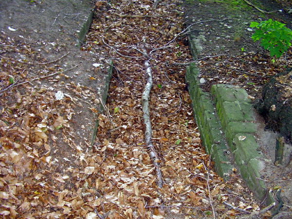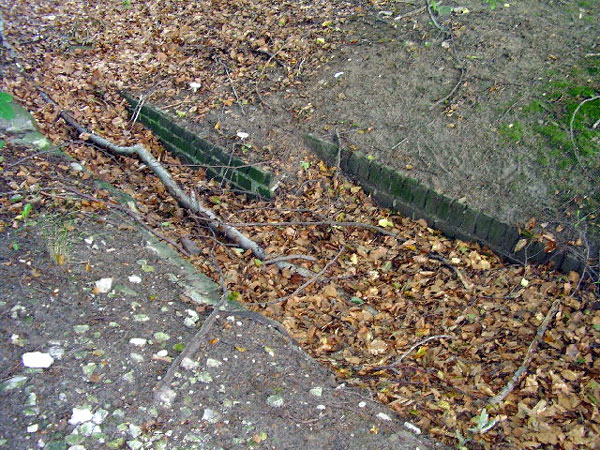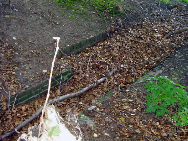 Zu erkennen ist eine Art Laufgraben, der in einem Erdwall endet und dort offenbar im Boden verschwindet. Die nächste, damals schon existierende Wohnbebauung ist gut 200 Meter entfernt, ein Bunker an dieser Stelle ist also plausibel. Die Betondecke wurde abgetragen und der gemauerte Graben verschüttet. Zu erkennen sind ebenfalls Reste eines Eingangsbauwerkes.