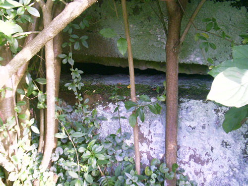Zu sehen ist ein Teil des halbrund gemauerten Sturzes des ehemaligen Einganges...