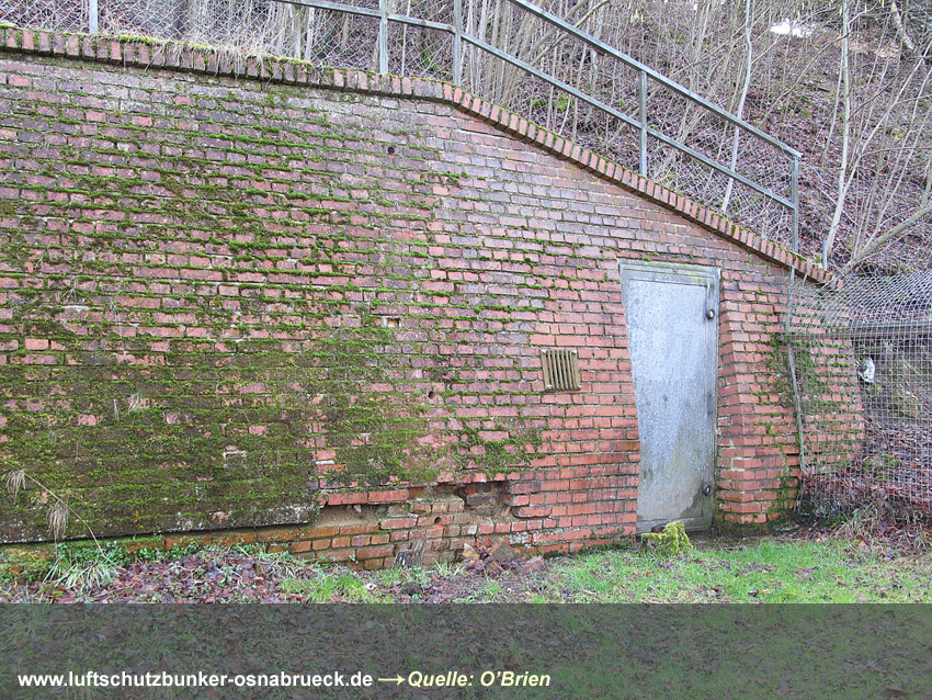 Auf dem oberen Foto ist der ursprüngliche Eingang 1 und 2 Feldstraße abgebildet. Die Aufnahme stammt von 1948, kurz vor der Sprengung dieser beiden Portale durch die Engländer. Die ersichtlichen Sandsäcke links dienten als Schutz vor Trümmerflug aus dem Stollen während der Detonation. Die beiden Betonquader über den Eingängen sind aufgrund Hinweisen nach der Sprengung heruntergefallen, begruben die Eingänge unter sich und liegen noch heute dort im Erdreich begraben. Die gesamten Vorportale brachen zusammen. Später wurden dann in den 1980er Jahren die beiden Eingänge neu geöffnet und mit Türen versehen.