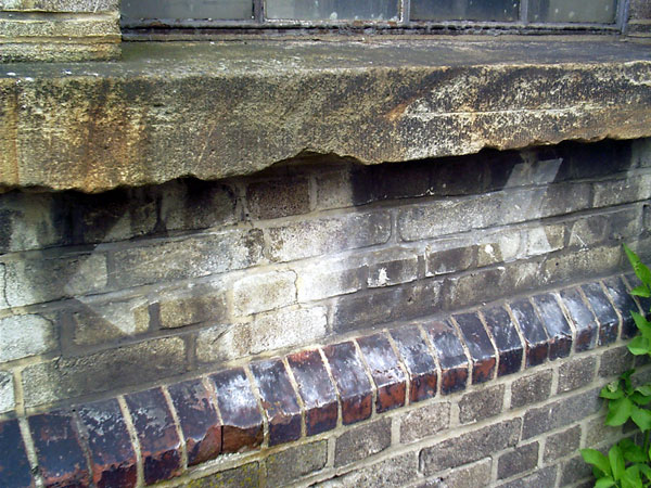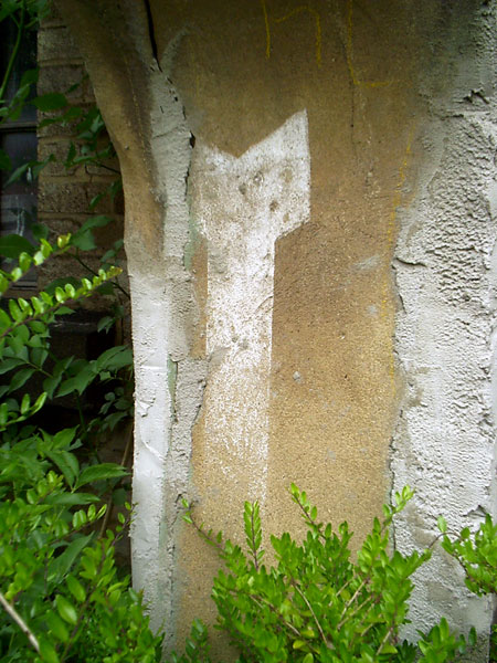 Dieser Mauerblock befindet sich vor einem Kellerfenster in der Nähe der Pfeile. Er könnte etwas mit LS-Zwecken zu tun gehabt haben, obwohl das Mauerwerk jedoch neueren Datums zu sein scheint. Blick in den Schacht zum Fenster: