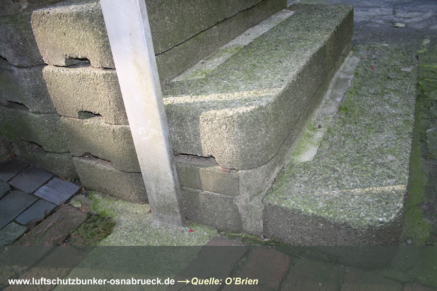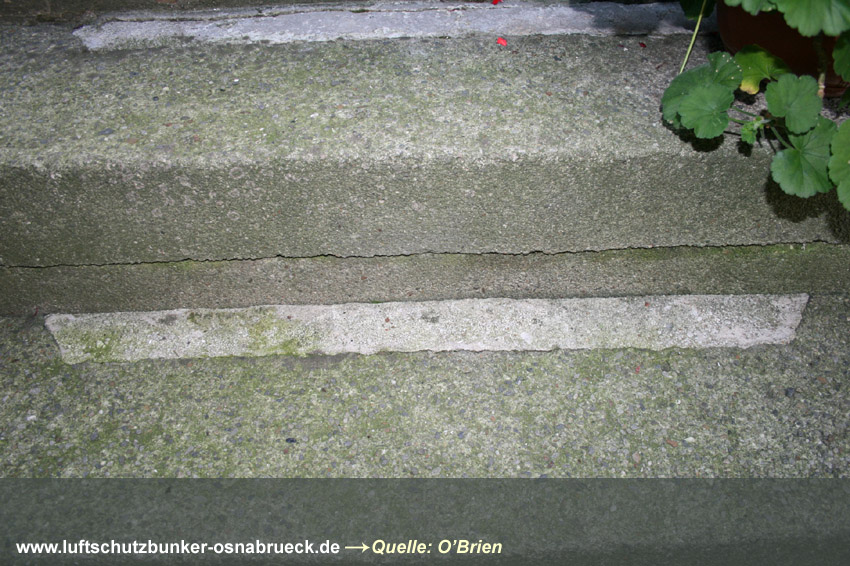 Drei weitere Blöcke sind aber hier noch vorhanden geblieben: Neben der Treppe fanden sich beim Abriss mehrere gestapelte Fertigbetonteile, die auch für die Deckenfertigung von Osnabrücker Deckungsgräben verwendet wurden. Sie waren nach 1945 zusammen / im Wechsel mit den drei weiteren - am Ort noch existenten - Blöcken / Blenden für die Wand eines Nachkriegsschuppens verbaut worden.