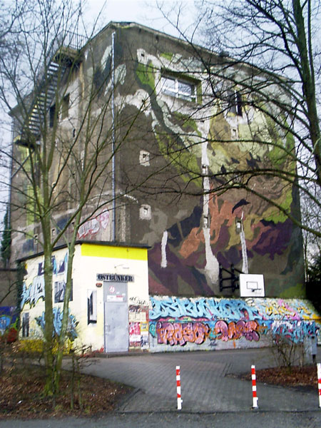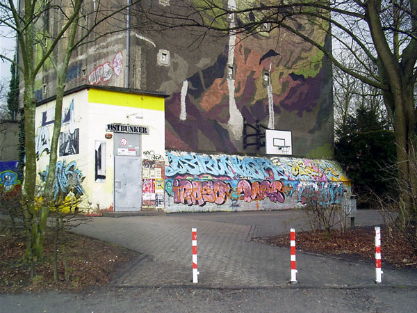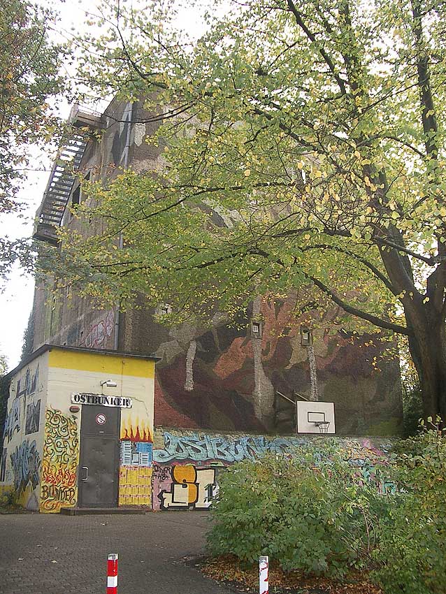 Der Hochbunker (eckiger Luftschutzturm) an der Oststraße, auch "Ostbunker" genannt, besitzt sechs Stockwerke, die durch zwei Splitterschutzeingänge erreicht werden können. Erbaut wurde er in der so genannten "ersten Bauwelle" ab Januar 1941. Fertig gestellt war der Bau im Frühjahr 1943. Geplant für 483 Personen wurden hier in Kriegszeiten bis zu 2000 Menschen gezählt. Auf dem Dach war zusätzlich eine Zwillingsflak zur Luftabwehr befestigt. Der Schacht des Munitionsaufzugs und der mutmaßliche ehemalige Zugang zum Dach existieren noch heute, dienen aber nun dem Heizungssystem. Die Stärke der Außenwand steigt von oben nach unten kegelförmig von 80 cm auf 1,20 m an. Die Innenräume der sechs Stockwerke waren damals in viele kleine "Kammern" mit einer Grundfläche von etwa 2,5 x 2,5 Metern unterteilt, die über zwei Zugänge vom Treppenhaus erreichbar waren. Vom Treppenhaus in der Mitte des Bunkers kam man in einen Flur, an den sich die Kammern anschlossen. Heute zeugen noch "Narben" auf dem Fußboden an einigen Stellen von der alten Unterteilung. Die schwarzen Fliesen, die sich überall finden, sind im übrigen alle original!