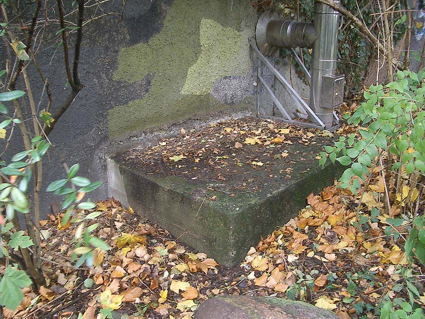 Der Dachsimsbereich wurde durch Bombeneinwirkung (die Bombe fiel am Sims entlang und riss diesen Bereich ab) an dieser Stelle zerstört. Diese Bombe wird unten am Bunker eingeschlagen sein und die obig beschriebenen Zerstörungen verursacht haben. Dort befindet sich logischerweise auch der nachträglich angebrachte zusätzliche Flankenschutz...