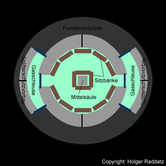 Die Wand- und Deckenstärke dieser Rundbunkerbaureihe wird auf jeweils 2 Meter geschätzt.