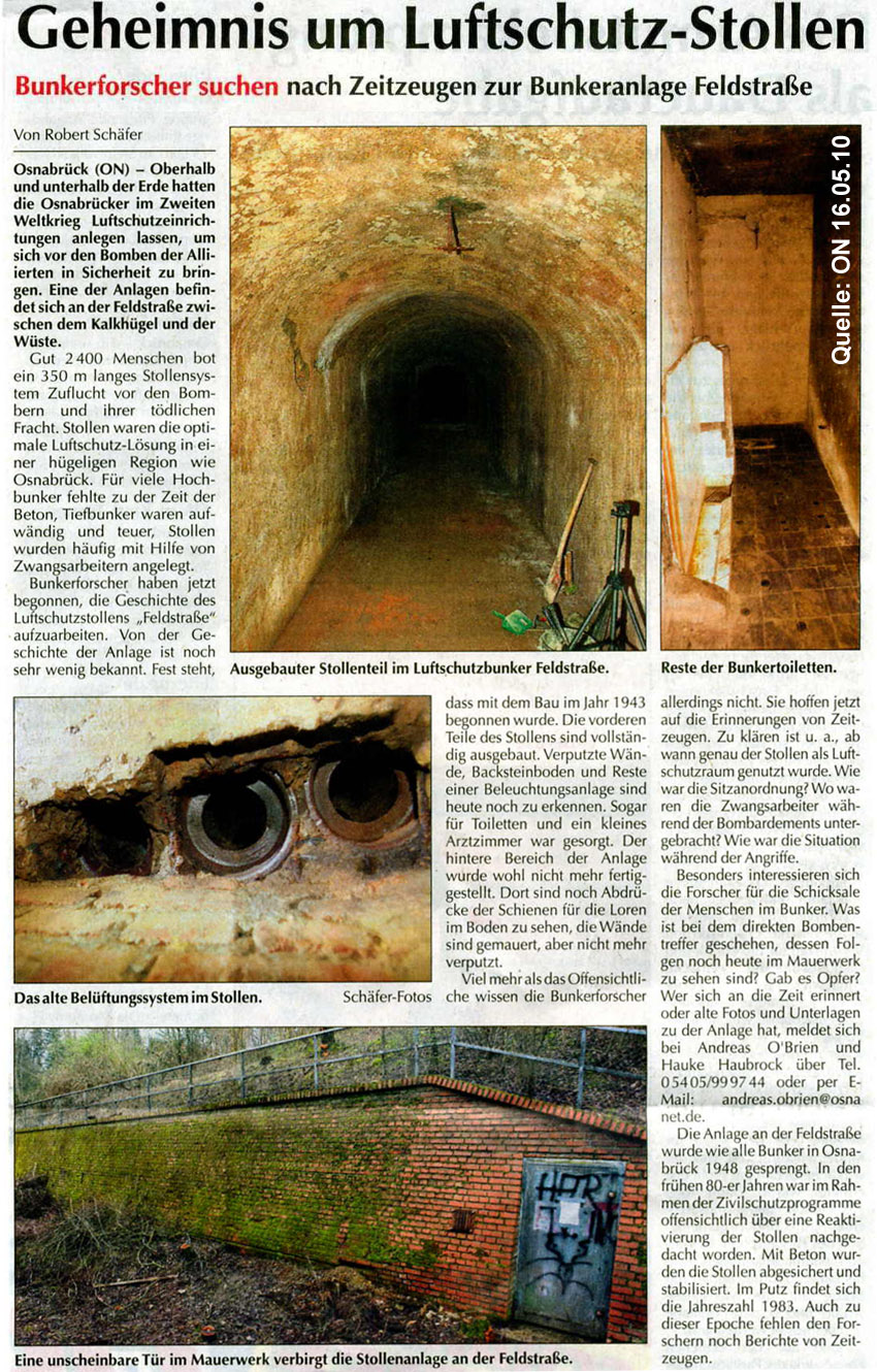 Artikel über den LS-Stollen Kalkhügel in Osnabrück in der "ON" vom 16.05.10: