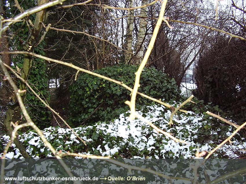 Geklärt am 19.11.11: Es handelt sich bei diesem bisherigen Verdachtsobjekt tatsächlich um einen LS-Bau. Unter dem Efeu verbirgt sich eine gut erhaltene Splitterschutzzelle des in Osnabrück und Umkreis verbreiteten Fabrikates Klöckner. Der genaue Standort der Zelle im Stadtteil OS-Wüste wird aus "Sicherheitsgründen" nicht veröffentlicht.
