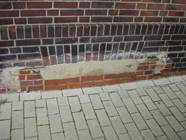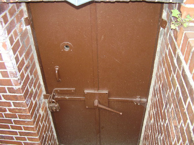 Ersichtlich sind vermauerte Kellerfenster und eine Stahltür. Wer besitzt