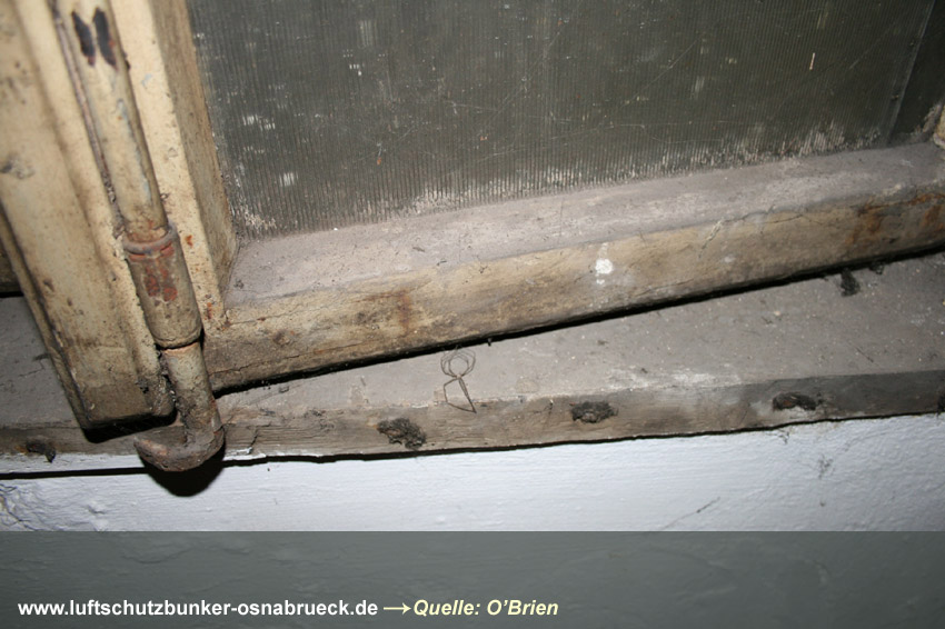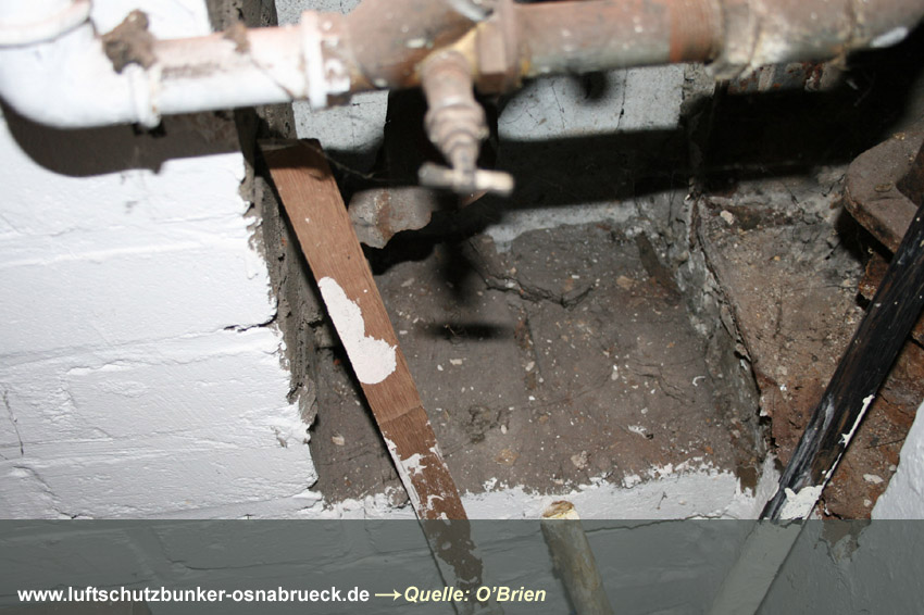 Einfacher, äußerlich nicht sichtbar verbunkerter LS-Keller im Stadtteil Wüste in Osnabrück (in Tabelle nicht aufgelistet). Interessant sind wieder die Steigeisen am Notausstieg und die Türen aus Massivholz. Betontrümmer im Freien am Keller könnten Reste von Stahlbeton-Schutzblenden der Fenster darstellen. Auch ein Pfeil ist noch an der Gebäudewand zu sehen. Erhalten